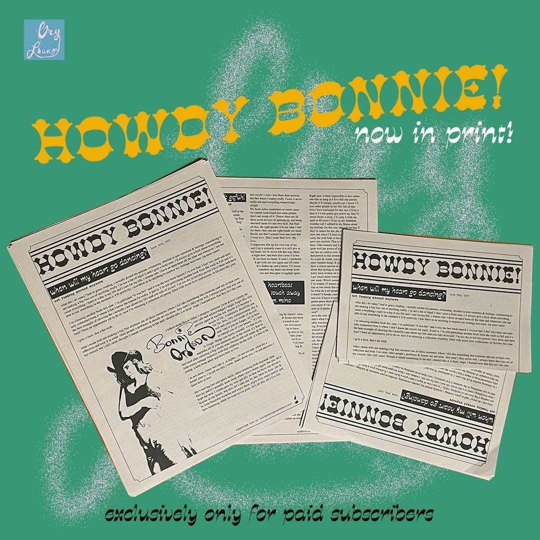 // this is a free post for everyone (free and paid subscribers, and those who aren’t subscribed at all) - I’d appreciate your upgrade to the paid subscription which allows me to keep writing, especially as this year ahead of us is one where I wanna focus on this online journal. Last year made me realise how much blood and heart I’m laying in my words on these pages, so sincerely I wished for I’d be my number one profession. It’s 99€ a year or 9€ per month and it unlocks weekly lyrical essays & musings, love-confessing poetry and podcast episodes on diary entries and youthful observations of life. plus you’ll unlock already a big archive of two dedicated years of writing and growing into a newly adult in this world. as well as the beloved first printed edition of the Howdy Bonnie! newspaper :) if you’ve got questions, please reply to this email or send one over to thecrylounge@gmail.com. Also make sure to follow me on my Instagram dedicated for this publication @ howdybonnie - I give away discounts on this subscription once a month for the one who replies first. subscribe now below with entering your email!